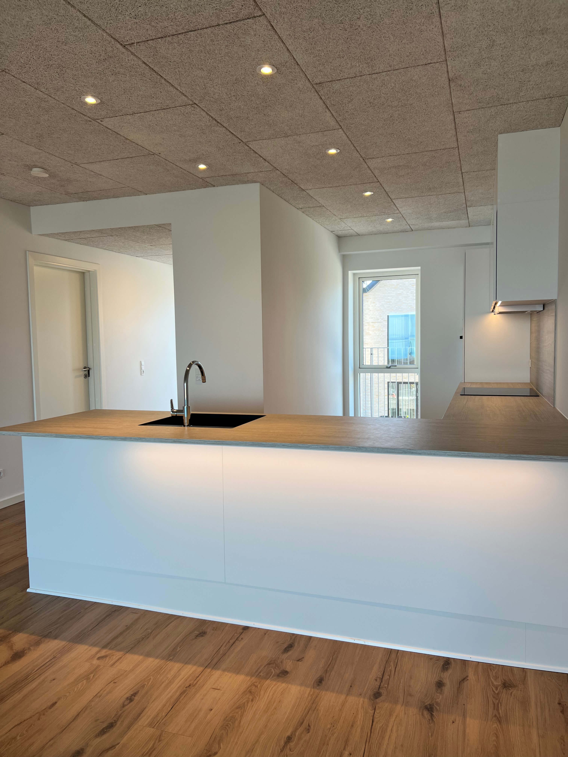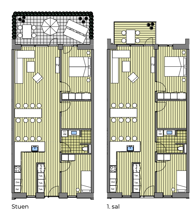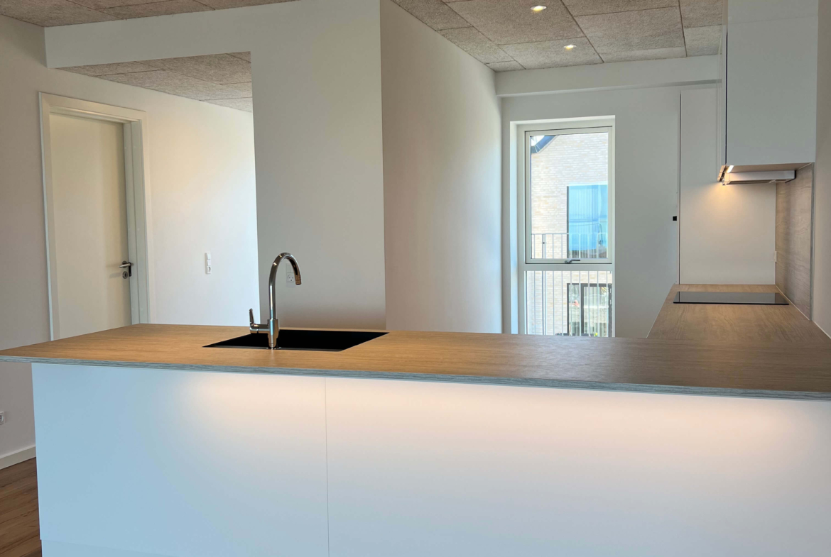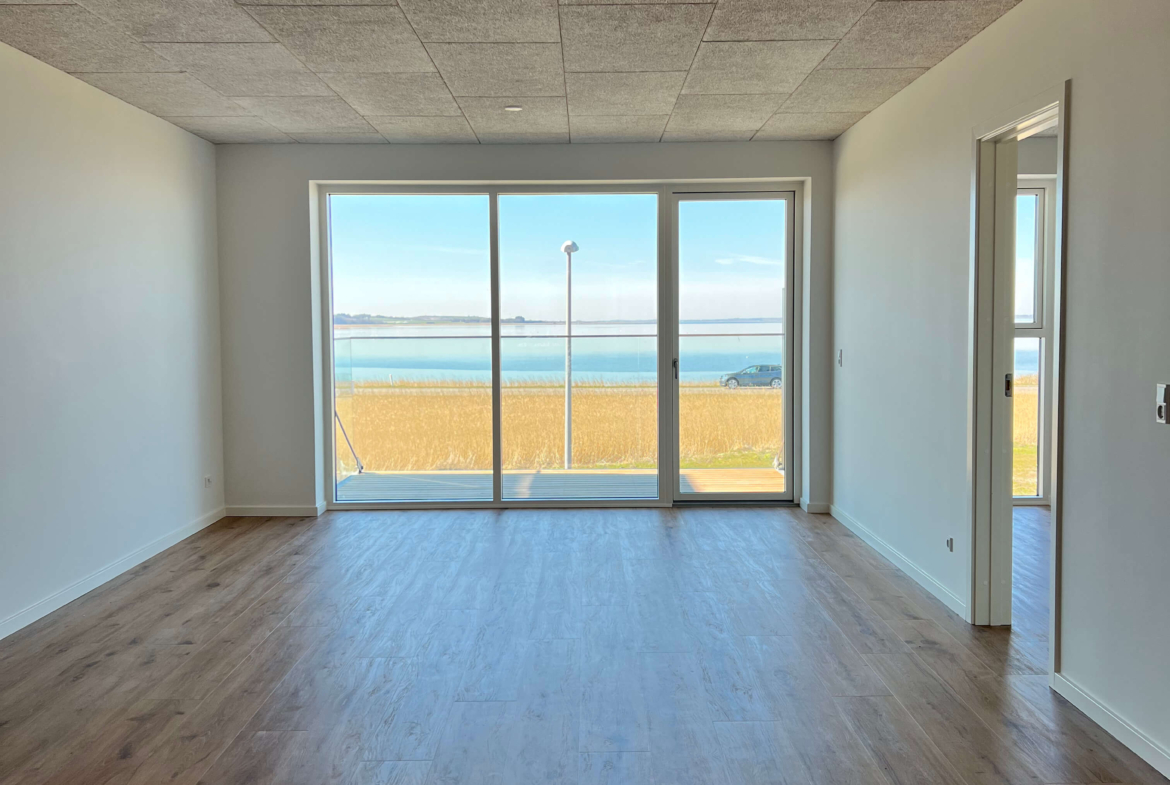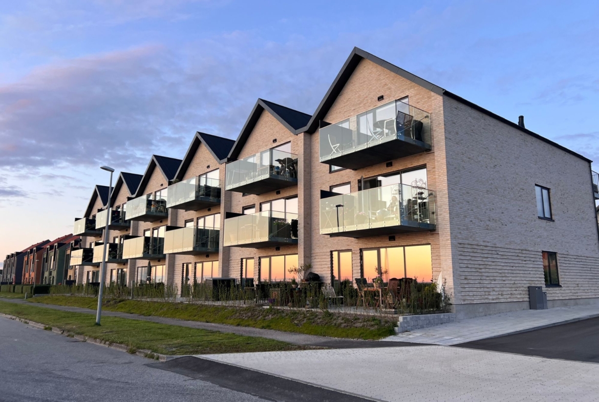 18 lejligheder på ca. 113 m2 inklusiv fælles adgangsareal. Lejligheder i stueplan har egne terrasser mod fjorden. Første og anden etage har adgang til egen altan.